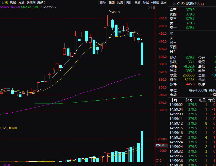 行情数据显示,?上海国际能源交易中心挂牌的原油期货各合约均大幅下跌,其中于今年5月份交割的sc2105合约收盘报379.5元,下跌8.02%,封死跌停板。在价格大跌的同时,该合约成交量较此前交易日明显放大。? ?