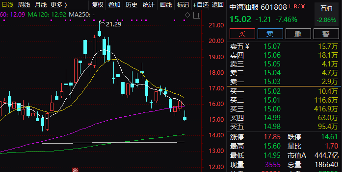 中海油服暴跌7.46%,股价报15.02元,盘中低至14.95元,创最近一个月新低。?