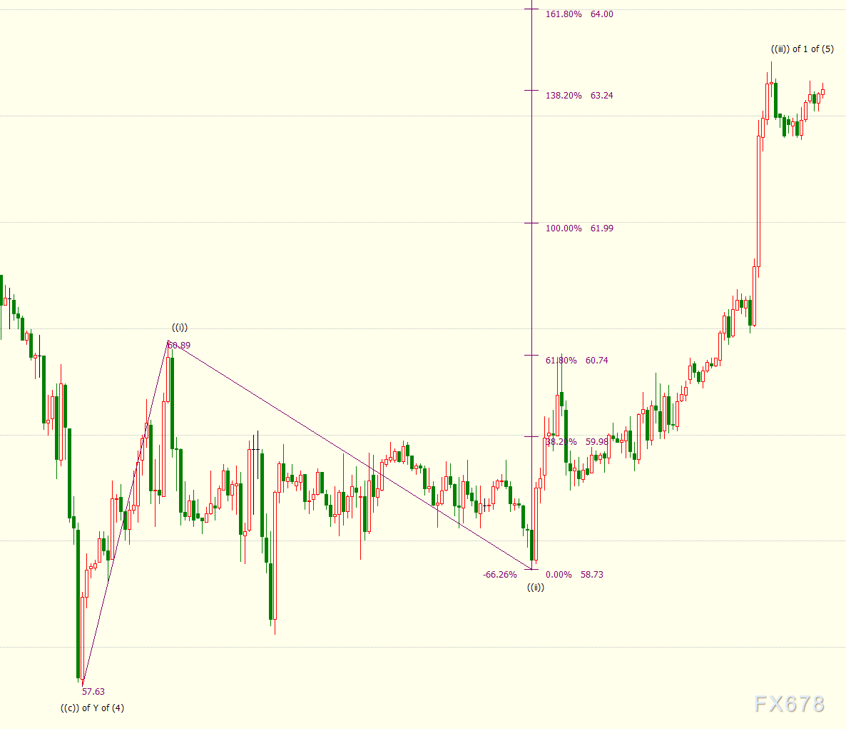 日线图上看,NYMEX原油可能自57.63美元开启上行(5)浪走势。小时图上看,油价处于自58.73美元开启的上行((iii))浪,升破138.2%目标位63.24美元,下一道阻力看向161.8%目标位64美元。((iii))浪是同样自57.63美元开启的上行1浪的子浪,1浪是(5)浪的子浪。